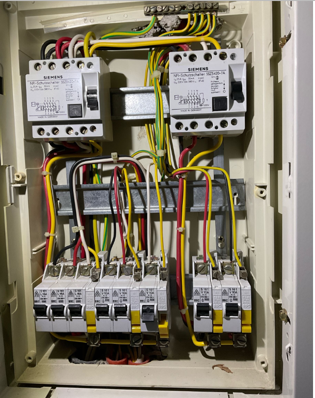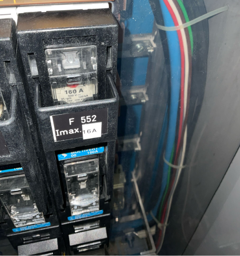 Die Leitung in Gruppe F 552 ist übersichert. Für den vorhandenen Kabelquerschnitt 3×2.5 ist eine maximale Absicherung von 16 A zulässig, jedoch ist eine 160 A Sicherung verbaut.
