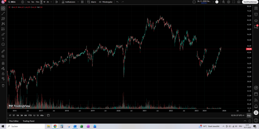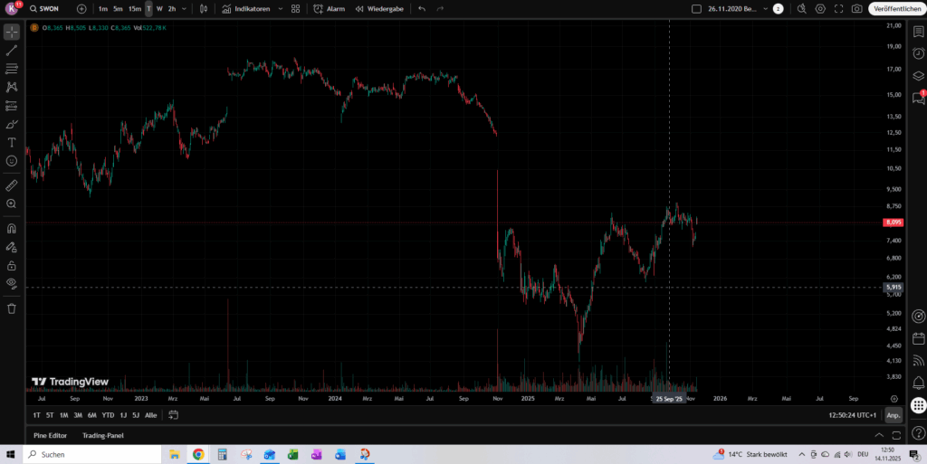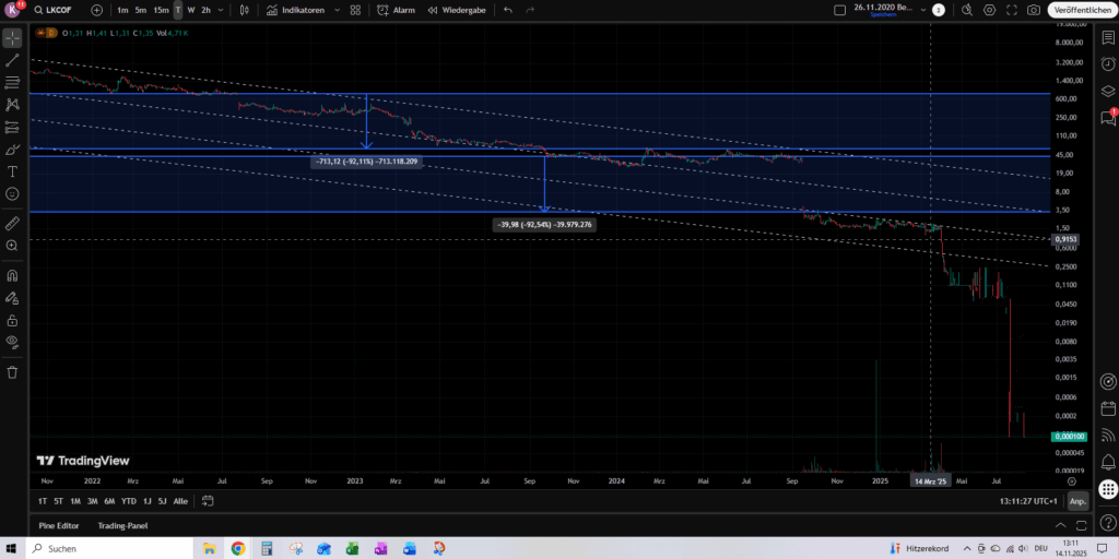 Die Kurse haben die Linie überschritten, die ich über die letzten maximalen Kursstände gelegt habe, sind danach jedoch zurückgefallen. Das bedeutet, dass die Linie bestätigt wurde, und in der vergangenen Woche sind die Kurse stark gestiegen. Das ist ein deutliches Hausse-Signal, und nach Fibonacci könnten die Preise bis etwa 7’400 Punkte steigen.